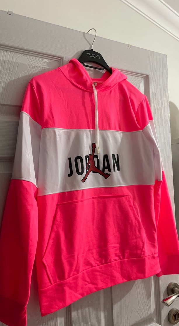 Rahat kesim, uzun kollu, bisiklet yaka erkek sweatshirt. Önü fermuarlı, canlı pembe ve beyaz renklerde Jordan baskılı. Yumuşak ve sıcak kumaşlıdır. Ortasında küçük bir lekesi var