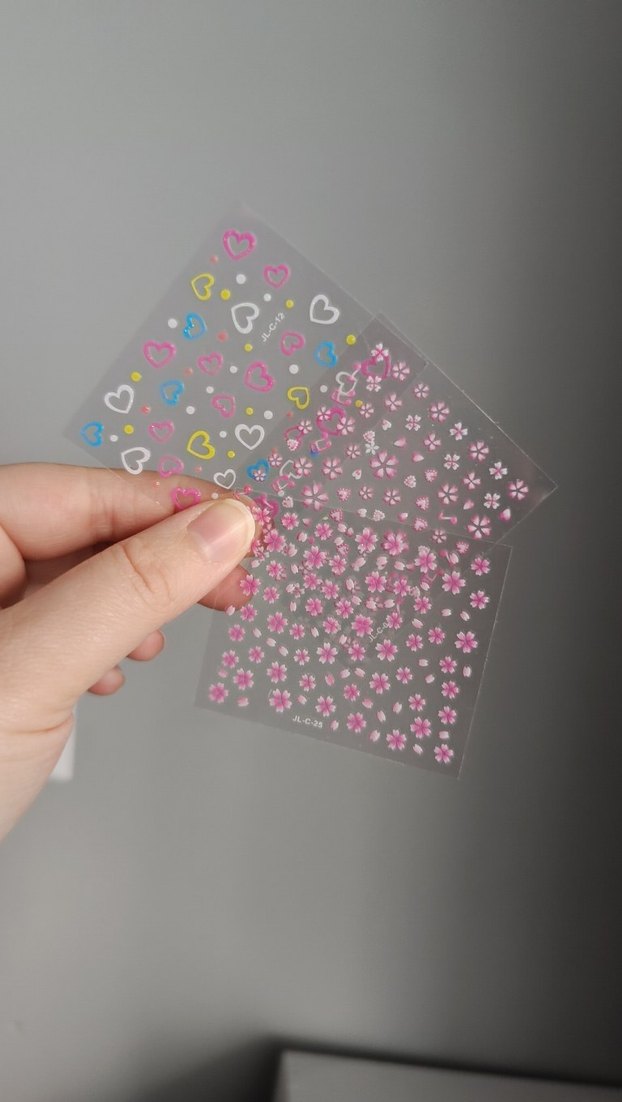 Renkli pembe kalp ve çiçek desenli tırnak süsleri. 3lü set şeklinde