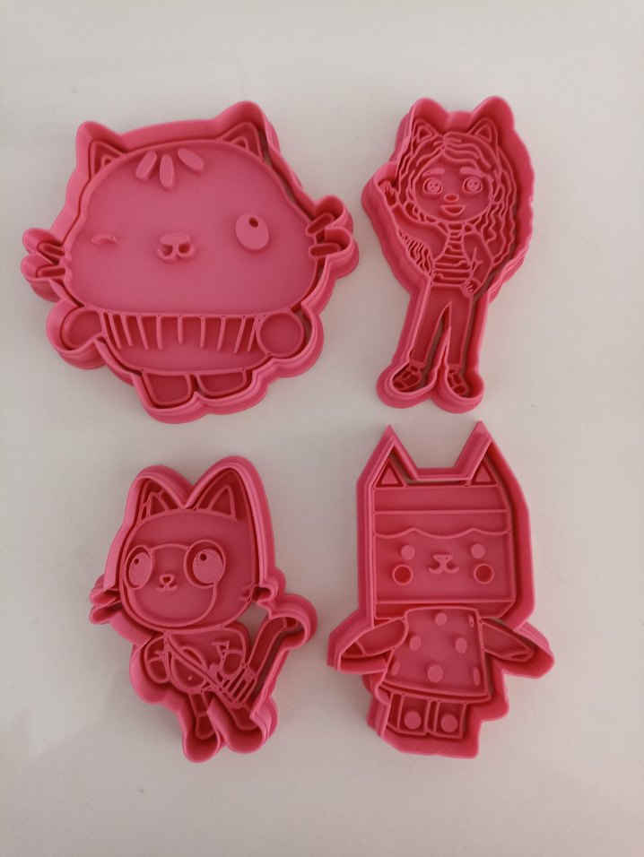 Çeşitli çizgi karakter şekillerinde renkli pembe kurabiye kalıpları, hamurun kolay şekillendirilmesi için uygundur.