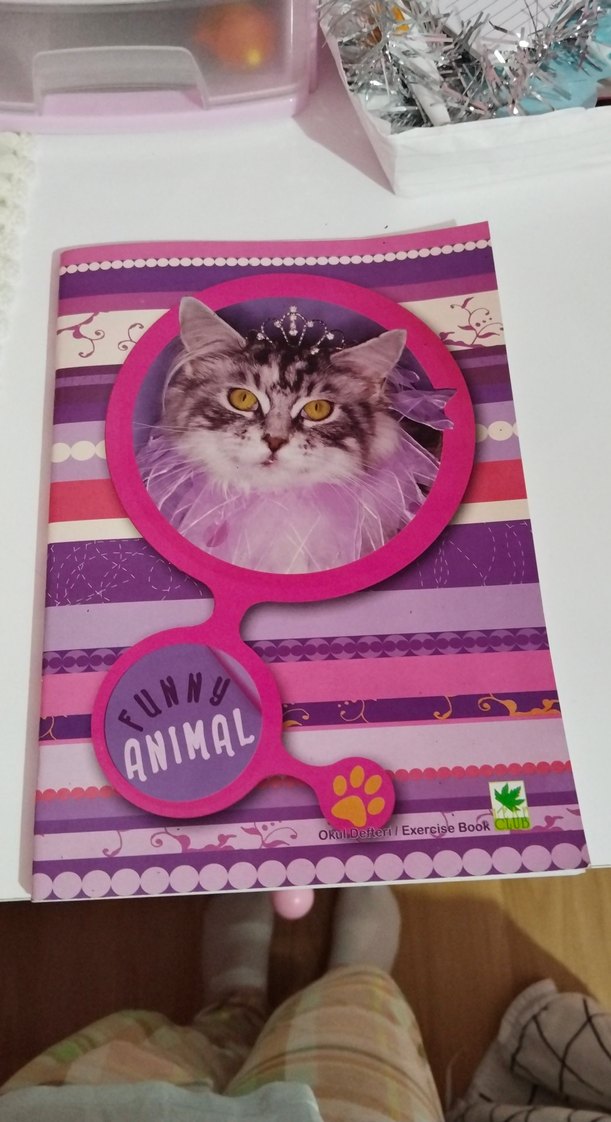 Pembe ve renkli tasarıma sahip kedi aksesuarı, kedi resmi ve 'Funny Animal' yazısı içerir. Egzersiz veya not defteri olarak kullanılabilir.
