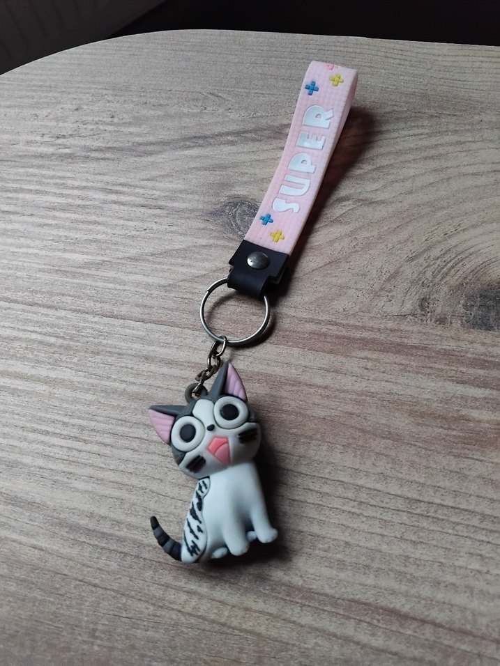 Pembe kayış üzerinde 'SUPER' yazılı, renkli ve tokalı bu anahtarlık sevimli kedi figürü taşır. Sokak tarzı ve minimalist punk havası verir.