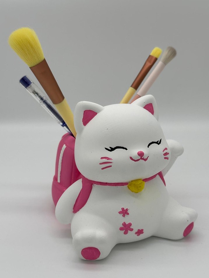 Renkli pembe kedi figürlü kalemlik, kalem ve fırçalar için tasarlanmış, gülen kedi ve çiçek detayları ile küçük bir çan içerir.