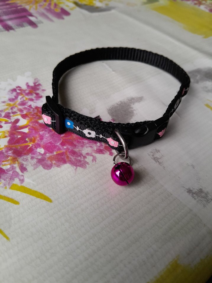 Renkli, ayarlanabilir siyah tasma üzerine pembe çan takılmış kedi tasması.