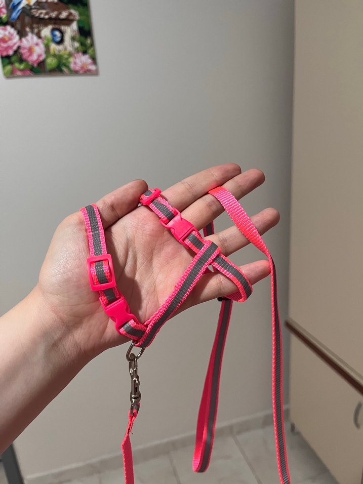 Ayarlanabilir bantlara ve sağlam klipslere sahip renkli pembe kedi tasması ve gezdirme kayışı seti, yürüyüşlerde rahatlık ve kontrol sağlar. Küçük kediler için uygun. Kedim 3 kg olunca sığmadı, hiç kullanılmadı