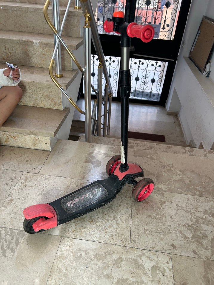 Kırmızı renkli, üç tekerlekli çocuk scooterı, dengeli sürüş sağlar. Renkli tasarımı çocuklar için uygundur.
