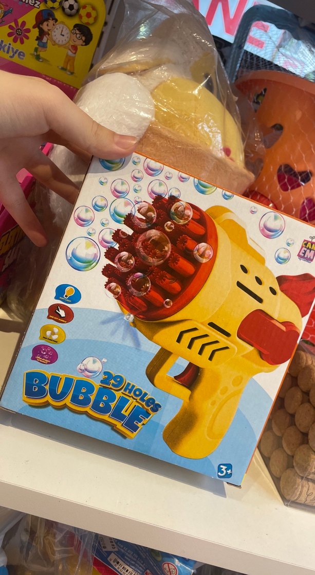 Renkli pembe köpük tabancası, 29 delikli köpük çıkarır. 3 yaş ve üzeri çocuklar için uygundur. BUBBL markalıdır.