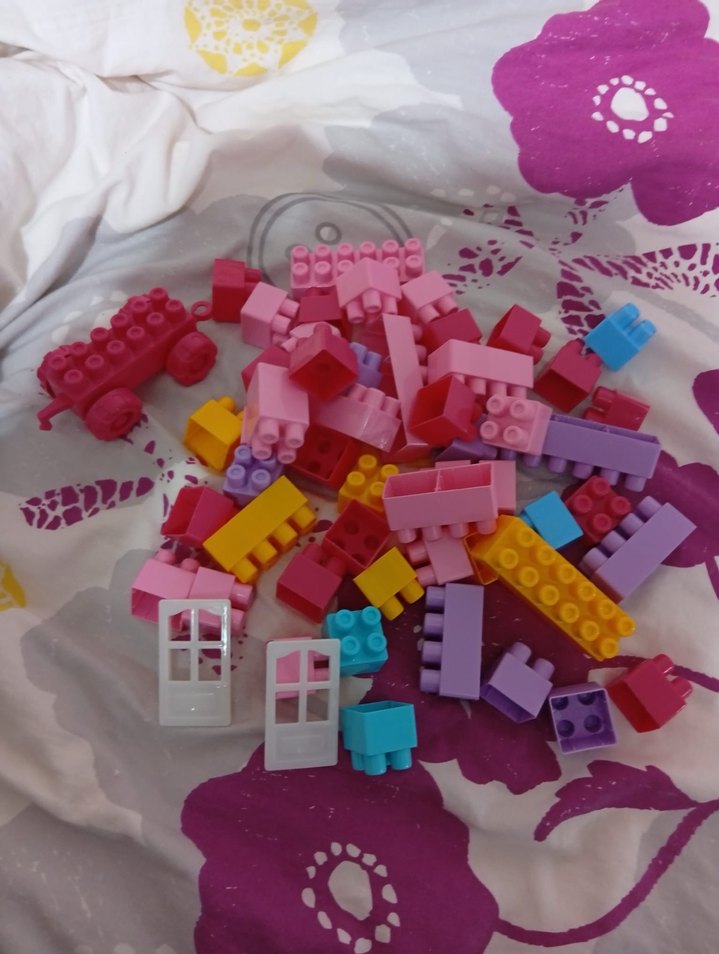 Farklı şekillerde, pencere ve tekerlek parçaları da dahil renkli pembe Lego blokları. Yaratıcı yapılar için uygundur. Çatlak kırık yoktur kullanılmadı