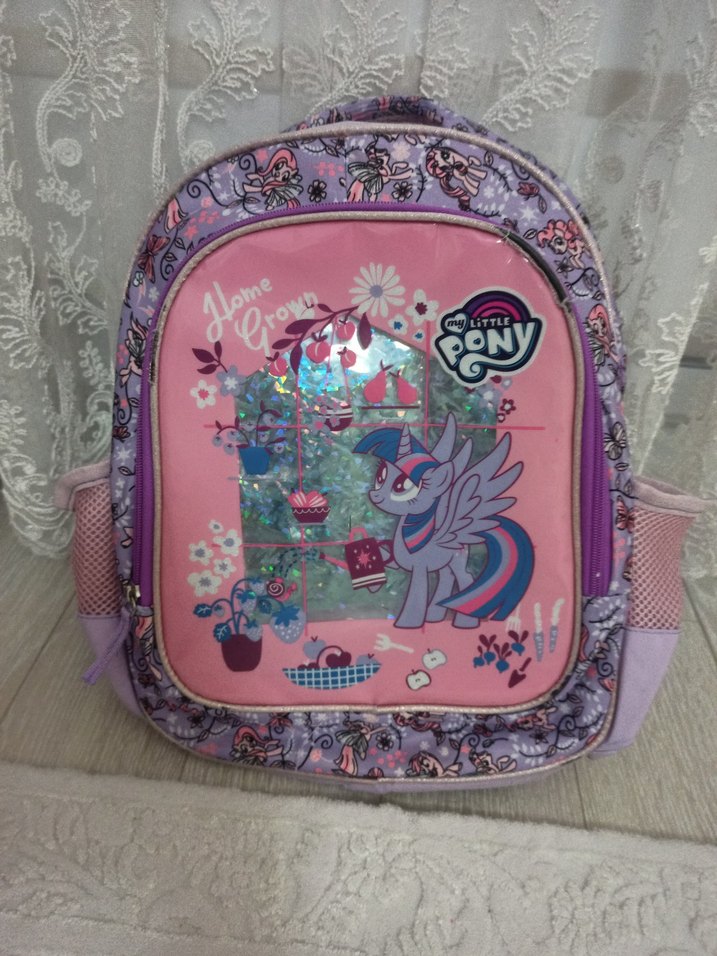 Renkli pembe çocuk okul çantası, Little Pony figürü ve çiçekli detaylar içerir. Yanlarda file cepler ve ön kısımda ek bölme bulunur.