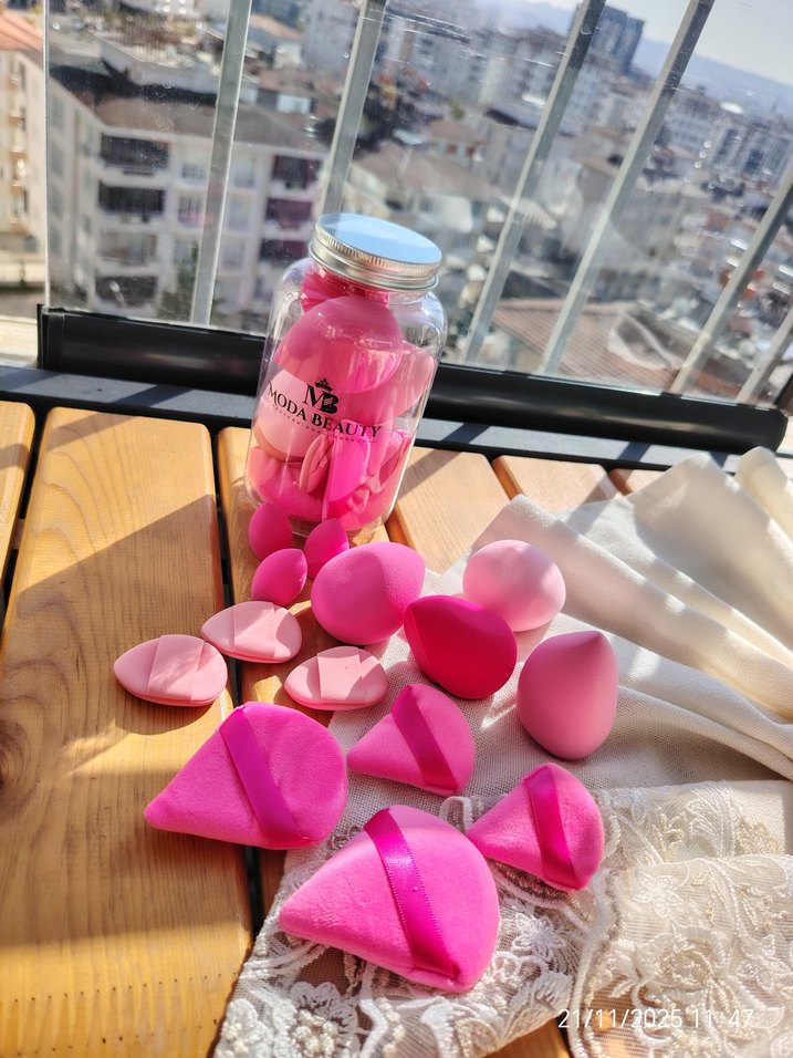 Farklı şekillerde renkli pembe makyaj süngerleri içeren set, pürüzsüz uygulama sağlar. Süngerler kapaklı şeffaf kavanozda sunulur.