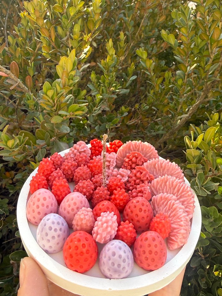 Çeşitli pembe meyve ve berry şekillerinde renkli mumlar, beyaz tabak üzerinde düzenlenmiş.