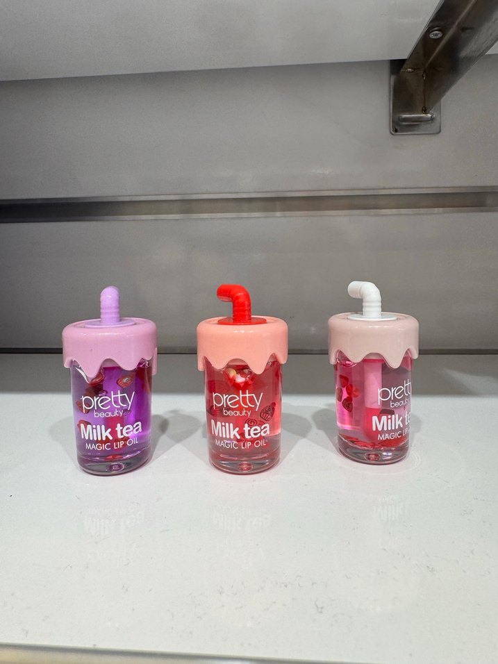 Milk tea temalı, renkli pembe dudak parlatıcısı. Parlak bitişli ve pipet şeklinde kapaklı. Pretty markasına ait.