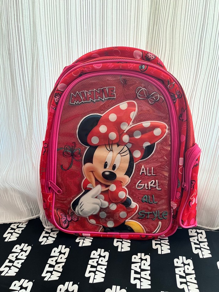 Renkli pembe Minnie Mouse figürlü okul çantası, çok bölmeli ve yan ceplidir. Üzerinde "ALL GIRL ALL STYLE" yazısı bulunur.