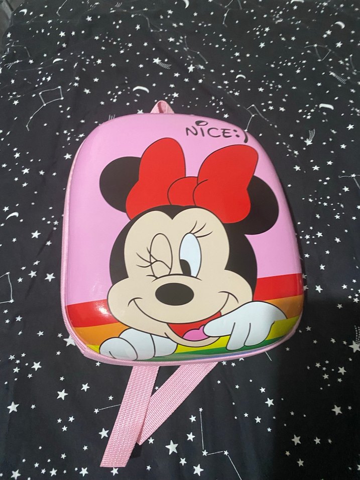 Minnie Mouse figürlü, kırmızı fiyonk detaylı, "NICE." yazılı renkli pembe çocuk okul çantası.