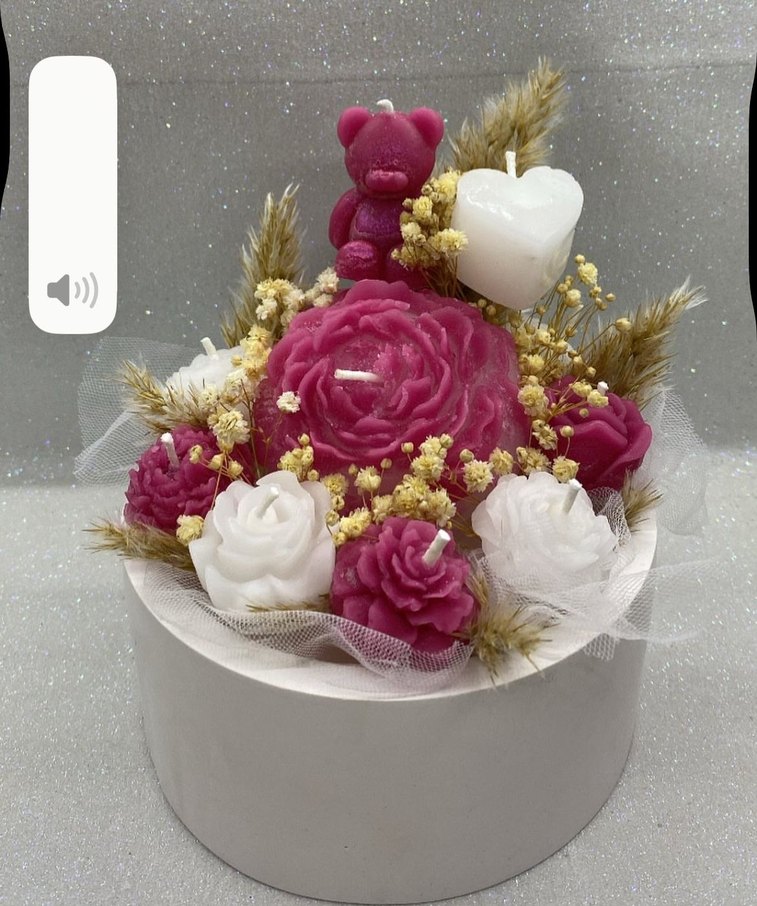 Çiçek, kalp ve ayı şekilli renkli pembe mumlar, beyaz yuvarlak tutucuda kurutulmuş çiçeklerle düzenlenmiştir ️.