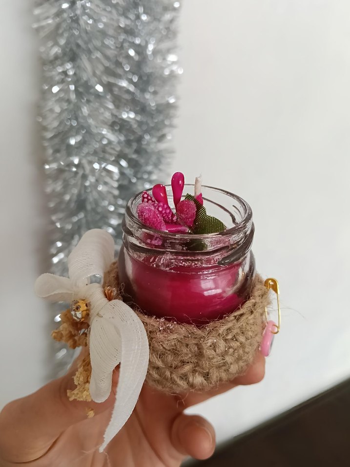 Renkli pembe mum, kumaş ve doğal süslemelerle cam kavanozda, örgü bir kılıf ve küçük çiçek detaylarıyla sunuluyor. ️