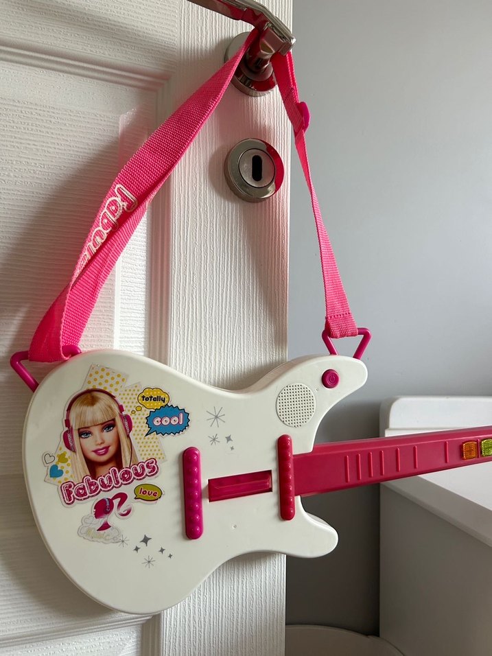 Ayarlanabilir askılı, eğlenceli çıkartmalı renkli pembe müzik oyuncağı gitar. Ses düğmeleri ile etkileşimli oyun sağlar.
