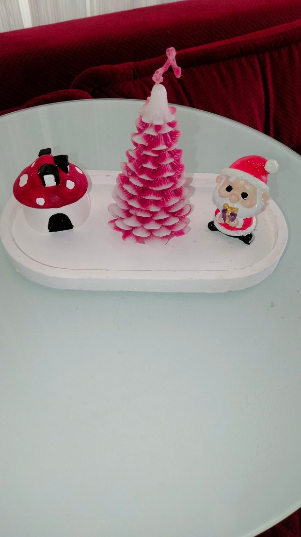 Pembe noel ağacı şeklinde mum, kırmızı beyaz mantar ev ve Noel Baba figürü beyaz tepside renkli set olarak sunuluyor. 1 tabak set fiyatıdır