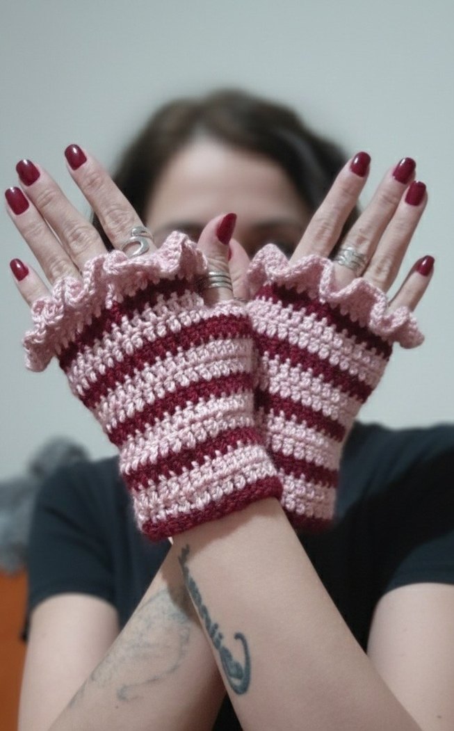 Renkli pembe örgü eldivenler, rahat çizgili desen ve fırfırlı kenarlarla goth ve bohem tarzlarını birleştiriyor. Retro, hippie görünüme uygundur.
