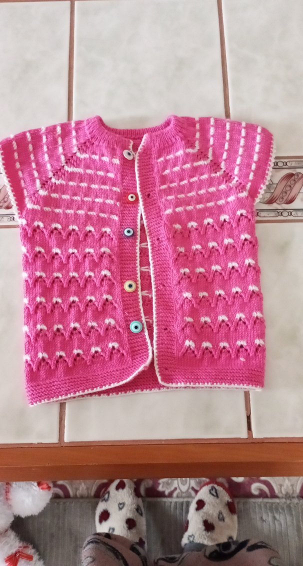Renkli düğmeli, bohem tarzda pembe örgü kız çocuk süveter. Kolsuz ve düz desensiz, normal kesimdir. el örgüsü bebek yeleği