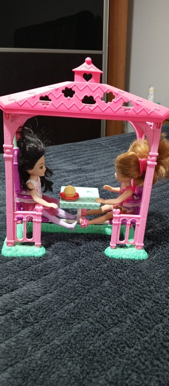 Renkli pembe oyun evi içinde iki bebek, masa ve aksesuarlarla detaylı tasarım sunar.