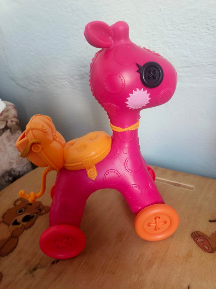 Renkli pembe oyuncak at, hareket için tekerlekli ve küçük bir eyerli tasarıma sahiptir.