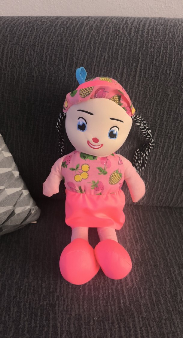 Meyve desenli pembe kıyafet ve eşarp takan, örgülü saçlı ve gülen yüzlü renkli oyuncak bebek.