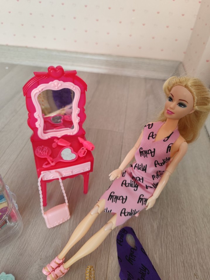 Anlil Aily adlı pembe renkli oyuncak bebek, pembe makyaj masası ve aksesuarlarıyla birlikte gelir. Aynalı ve küçük oyun eşyaları mevcuttur.