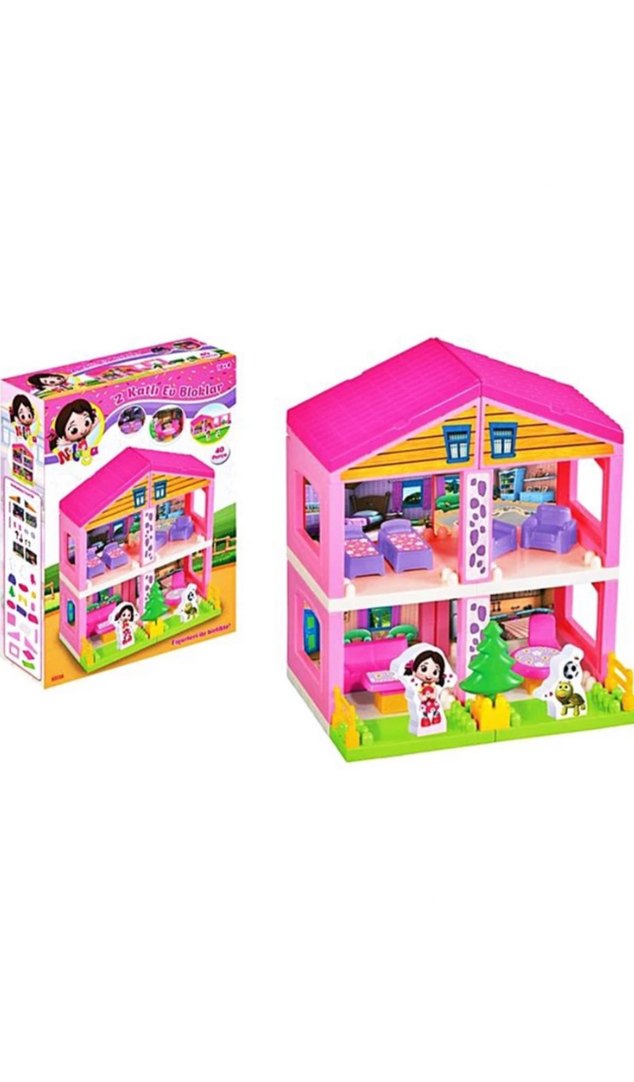 Renkli pembe oyuncak ev, çok odalı ve mobilyalıdır. Küçük figürler ve evcil hayvan içerir.