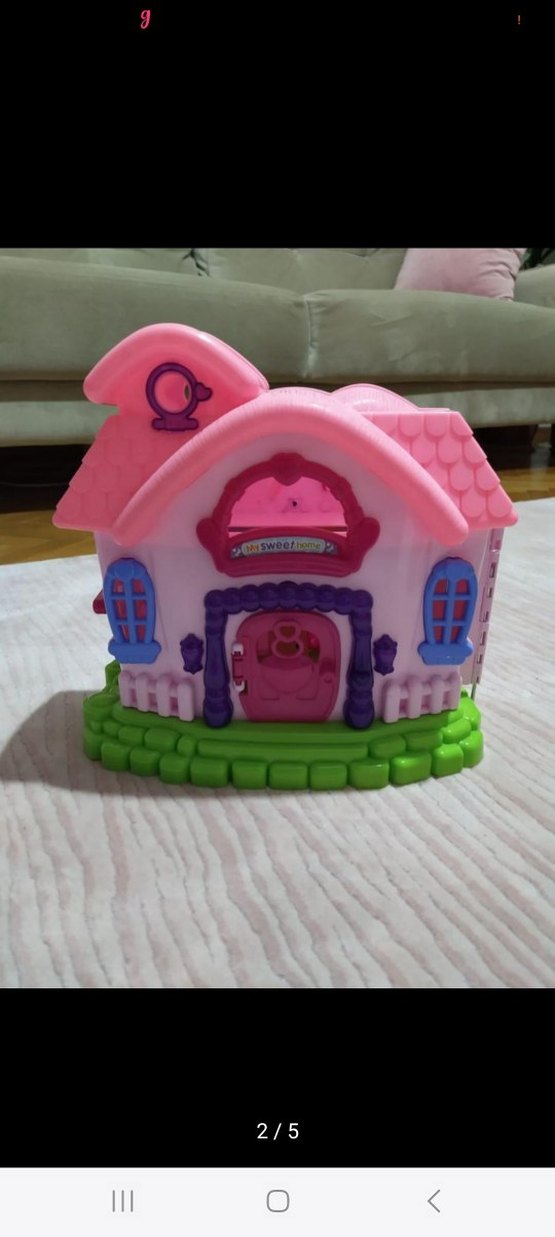 Renkli pembe oyuncak ev, mavi pencereler ve yeşil tabanlıdır. Detaylı çatısı ve küçük kapısı ile dikkat çeker. Üzerinde '8' sayısı bulunur.