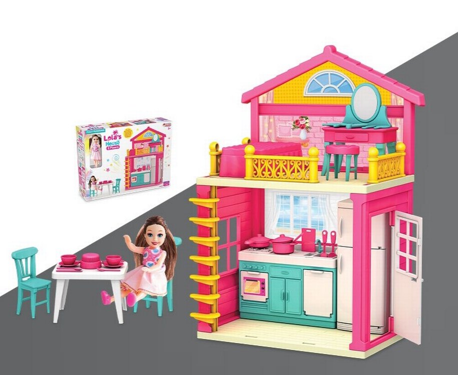Renkli pembe oyuncak ev seti, bebek, mutfak ve mobilyalar içerir, eğlenceli ve hayal gücünü destekler.