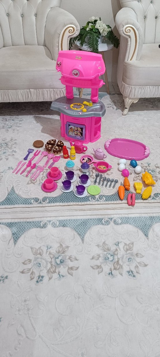 Renkli pembe oyuncak mutfak seti, ocak, çatal, tabak, fincan ve oyun yiyecekleri içerir. ️3 ayrı takım birleştirilip tek takım yapılmıştır. lütfen tek set fiyatı teklif etmeyin,yumrutalar kırılıyor, tepsi ,fincanalar, kaşıklar,tavalar, kekler, çikolata, ketçap mayonez,2 çaydanlık, meyve seti, çay ve pasta tabakları, resimdeki herşey fiyata dahil, fuşya renk çaydanlık kaynama sesi çıkarıp ışığı yanıyordu ama düştüğü için artık çalışmıyor ve kurpu kırıldı.