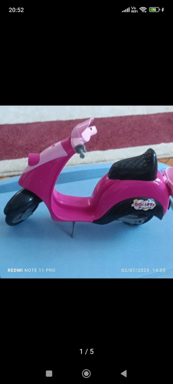 Renkli pembe oyuncak scooter, siyah oturaklı ve detaylı tasarıma sahip. Hayal gücünü destekler.