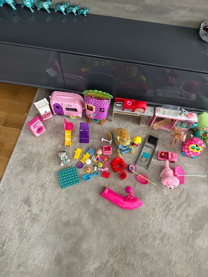 Bu renkli oyuncak seti, pembe ve canlı renklerde çeşitli minyatür mobilya ve figürler içerir, hayal gücünü destekler.