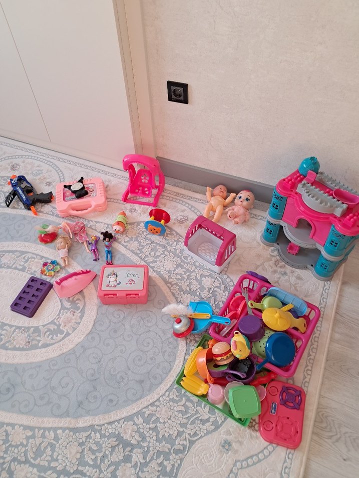 Hayal gücünü geliştiren çeşitli figürler, minyatür mobilyalar ve aksesuarlar içeren renkli pembe oyuncak seti. Bebekler, oyun evi ve mutfak eşyaları bulunur.