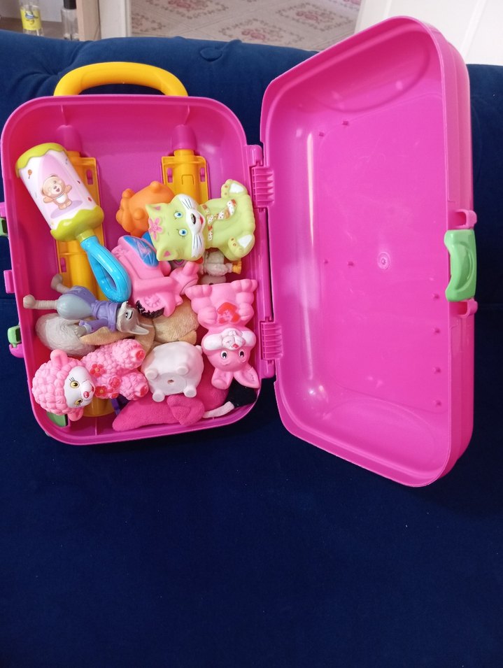 Sarı saplı pembe plastik kutuda çeşitli renkli küçük hayvan ve karakter oyuncakları bulunuyor. hepsinin fiyatıdır