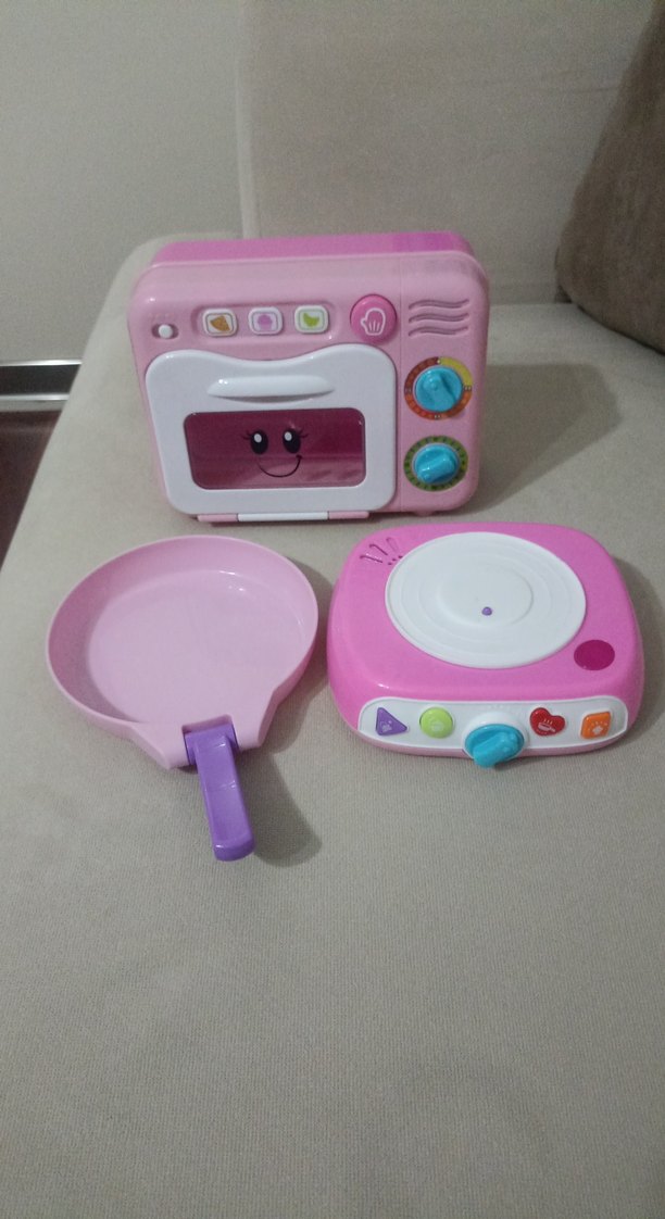 Gülümseyen fırın kapısı, kontrol düğmeleri ve tava içeren renkli pembe oyuncak tost ve sandviç makinesi seti. Hayal gücünü destekler.