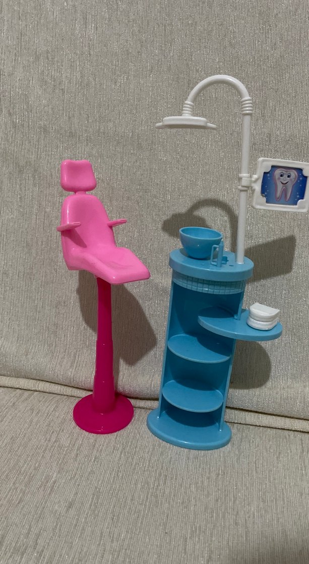 Diş temalı tasarıma sahip, küçük raflı mavi aksesuar standıyla birlikte renkli pembe oyuncak yüksek sandalye.