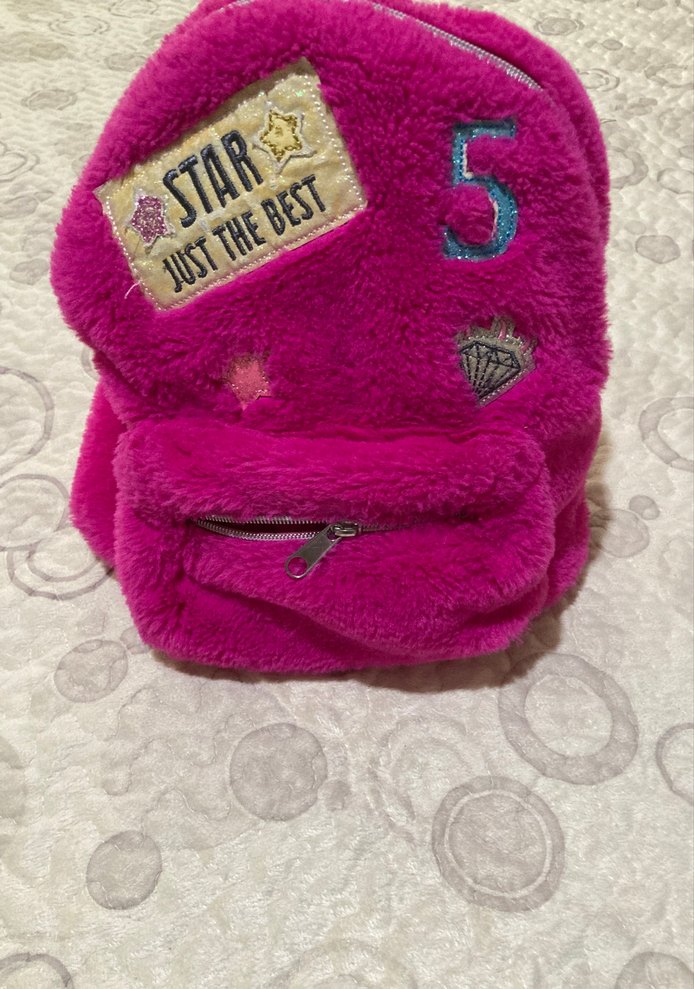 Renkli pembe peluş dokulu, yıldız ve sayı işlemeli çocuk sırt çantası. fermuarlı ön cep bulunur. ✨lcwaikiki