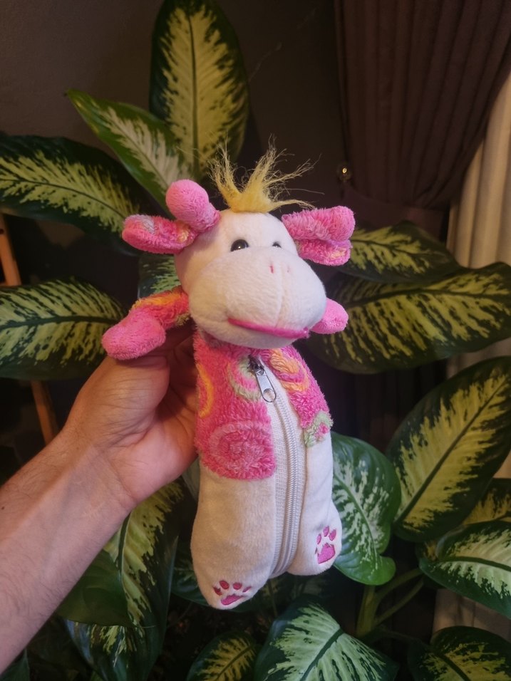Renkli pembe peluş oyuncak, yumuşak dokulu, fermuarlı ön kısmı ve sarı saç tutamı ile detaylandırılmıştır.