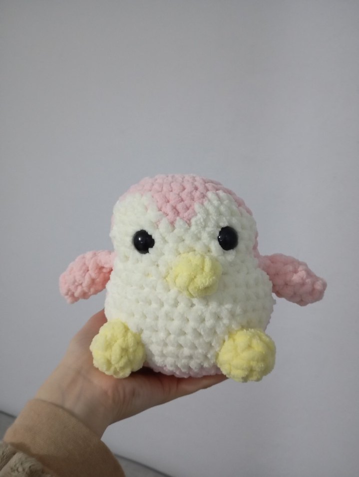 Yumuşak dokulu, pembe, beyaz ve sarı detaylara sahip renkli peluş penguen oyuncak.