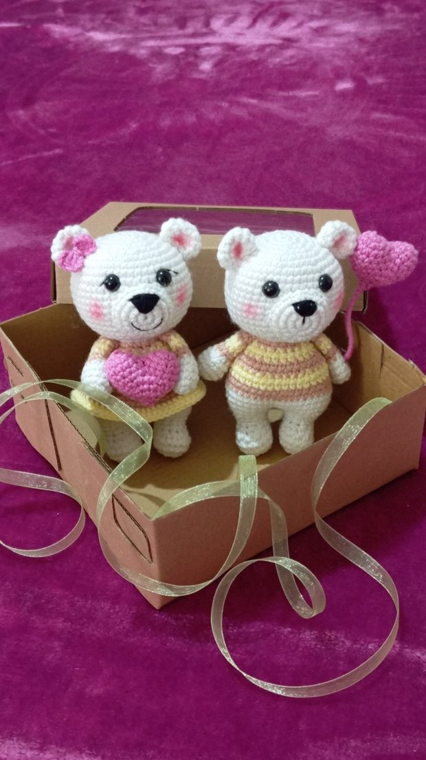 Bir kutu içinde, biri kalp tutan diğeri kalp şeklinde balon taşıyan renkli pembe örgü iki ayıcık seti.