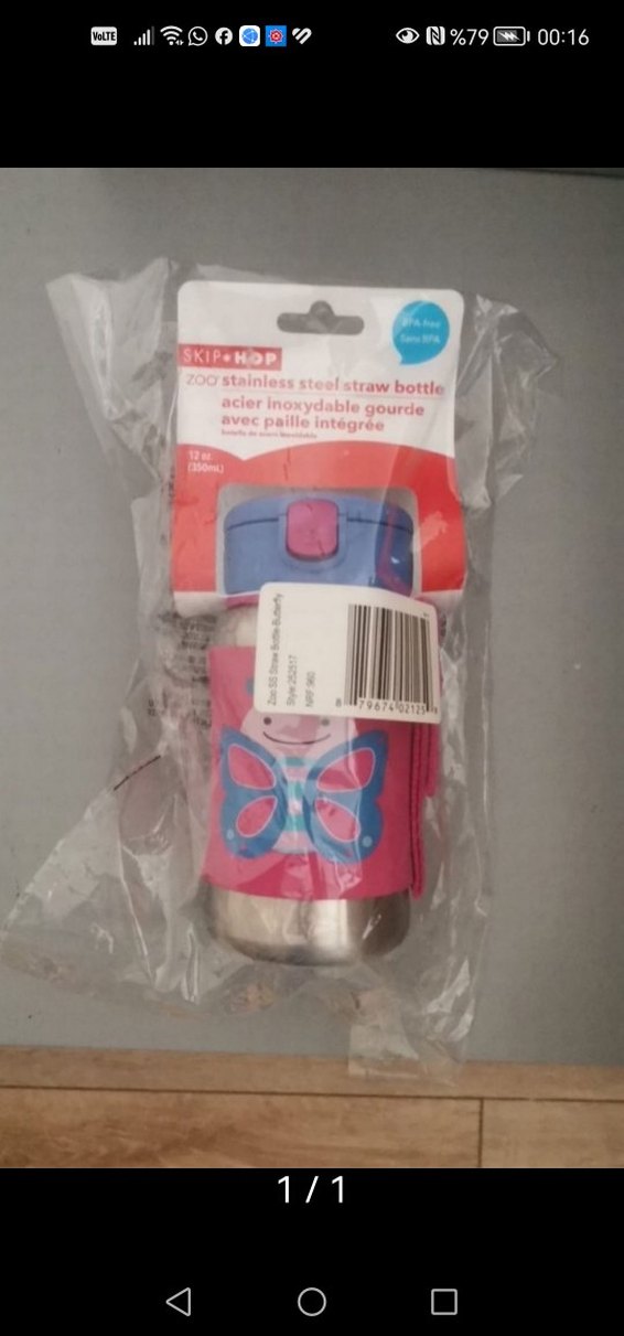 Renkli pembe SKIP.HOP paslanmaz çelik pipetli matara, entegre pipet ve kelebek desenine sahiptir.