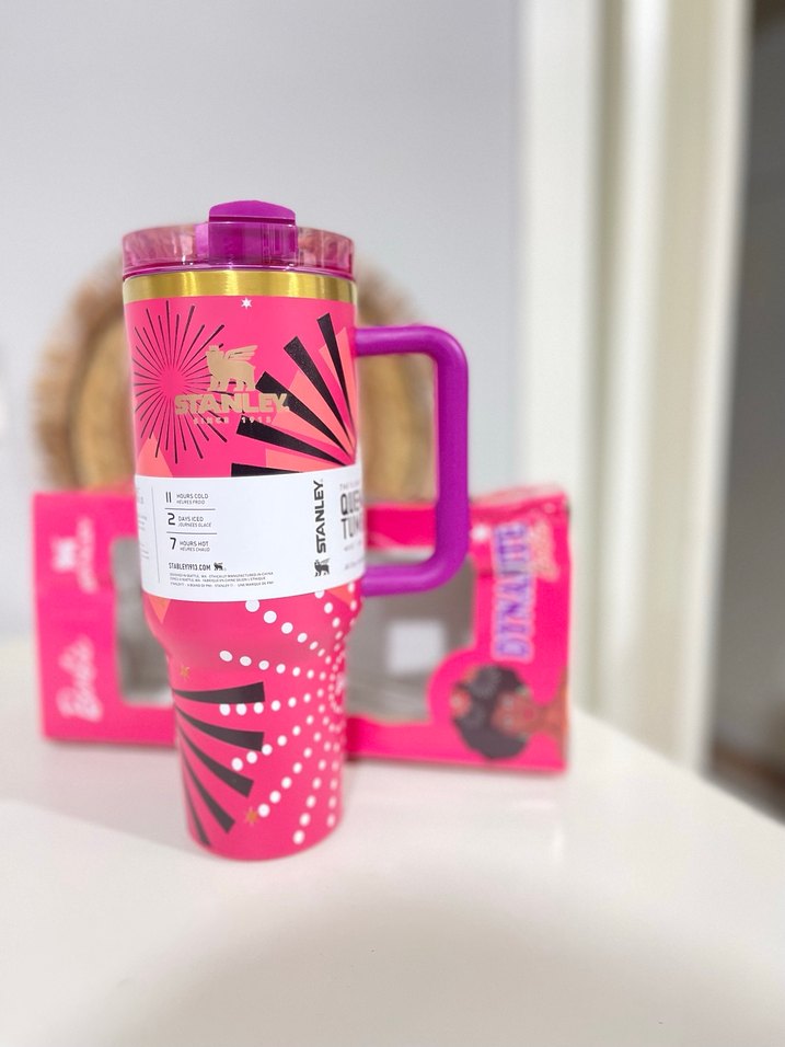Renkli pembe Stanley termosu, kolay taşıma için sağlam kulp ve güvenli kapak içerir. İçecekleri sıcak tutar.
