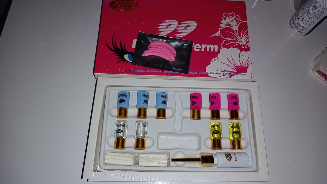 Renkli pembe takma kirpikler ve çeşitli uygulama araçları içeren set. Çoklu küçük şişeler ve hassas uygulayıcı bulunur.