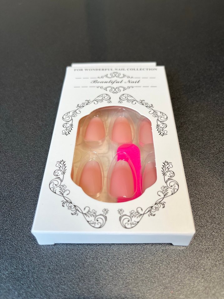 Yumuşak ve canlı pembe tonlarında renkli tırnak süsleri içeren set. 24 adet tırnak 24 adet yapıştırıcı bir adet törpü