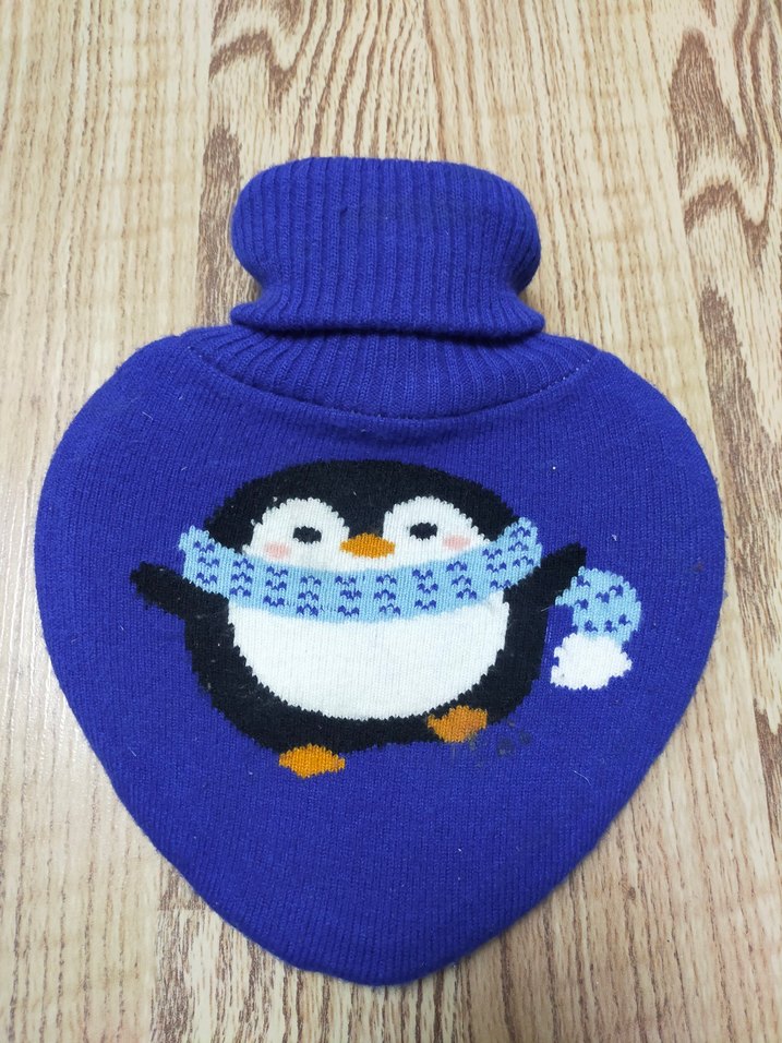 Renkli, penguen desenli, yumuşak örme kumaştan çocuk termoforu. Sıcak tutmak için uygundur.