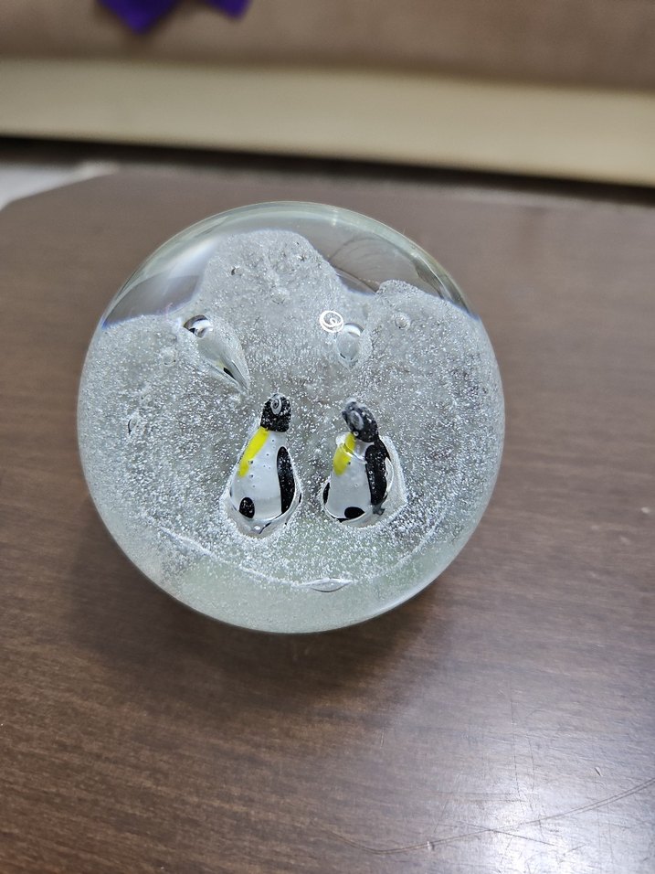 İki penguen figürü içeren, beyaz ve renkli detaylara sahip cam küre. Köpüklü tasarımıyla dikkat çeken dekoratif ürün. ❄️