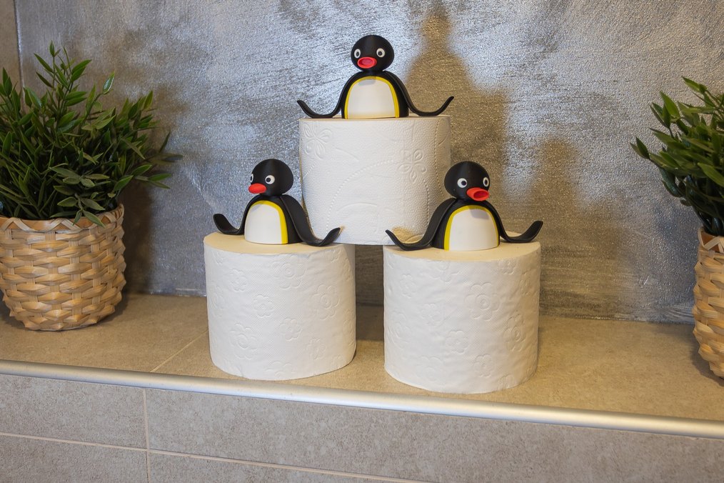 Renkli penguen figürleri beyaz tuvalet kağıdı rulolarının üstünde duruyor, banyoya eğlenceli bir dokunuş katıyor.