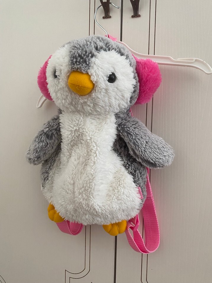 Yumuşak gri ve beyaz kumaştan yapılmış, parlak pembe kulaklıklar ve sarı gagası ile renkli peluş penguen çanta