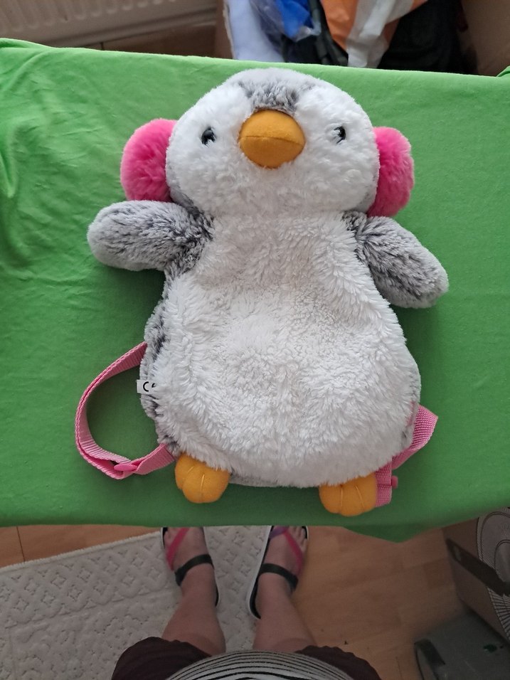 Yumuşak gri ve beyaz kumaştan yapılmış, pembe kulaklıkları ve turuncu ayakları olan renkli Penguen sırt çantası